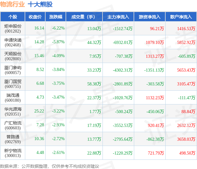 个股表现方面,物流行业当日领跌股为炬申股份(001202),该股当日报收16.14,下跌6.22%,成交量13.04万,主力资金净流出1512.74万元。申通快递(002468)以下跌5.87%紧随其后,该股当日成交量44.32万,主力资金净流出6932.01万元。除此之外,天顺股份(002800)、厦门象屿(600057)、厦门国贸(600755)均进入当日熊股之列。具体个股列表见下表: