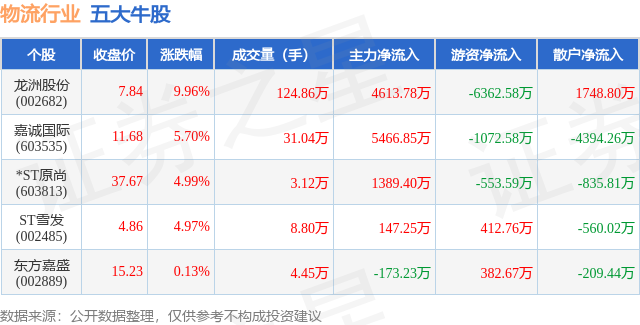 个股表现方面,物流行业当日领涨股为龙洲股份(002682),该股当日报收7.84,上涨9.96%,成交量124.86万,主力资金净流入4613.78万元。嘉诚国际(603535)以上涨5.7%紧随其后,该股当日成交量31.04万,主力资金净流入5466.85万元。除此之外,*ST原尚(603813)、ST雪发(002485)、东方嘉盛(002889)均进入当日牛股之列。具体个股列表见下表: