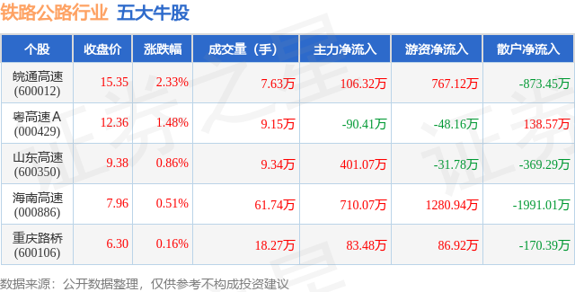 个股表现方面,铁路公路行业当日领涨股为皖通高速(600012),该股当日报收15.35,上涨2.33%,成交量7.63万,主力资金净流入106.32万元。粤高速A(000429)以上涨1.48%紧随其后,该股当日成交量9.15万,主力资金净流出90.41万元。除此之外,山东高速(600350)、海南高速(000886)、重庆路桥(600106)均进入当日牛股之列。具体个股列表见下表: