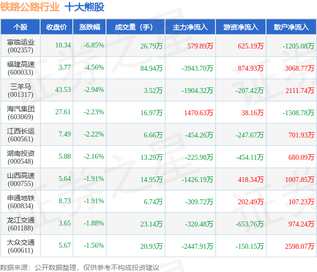 个股表现方面,铁路公路行业当日领跌股为富临运业(002357),该股当日报收10.34,下跌6.85%,成交量26.79万,主力资金净流入579.89万元。福建高速(600033)以下跌4.56%紧随其后,该股当日成交量84.94万,主力资金净流出3943.7万元。除此之外,三羊马(001317)、海汽集团(603069)、江西长运(600561)均进入当日熊股之列。具体个股列表见下表: