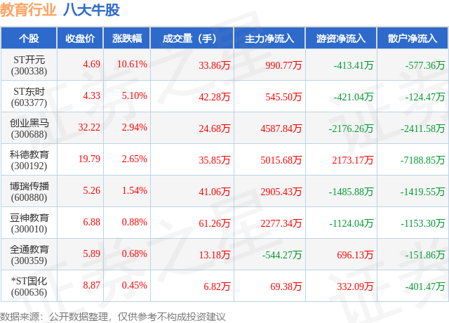 个股表现方面,教育行业当日领涨股为ST开元(300338),该股当日报收4.69,上涨10.61%,成交量33.86万,主力资金净流入990.77万元。ST东时(603377)以上涨5.1%紧随其后,该股当日成交量42.28万,主力资金净流入545.5万元。除此之外,创业黑马(300688)、科德教育(300192)、博瑞传播(600880)均进入当日牛股之列。具体个股列表见下表: