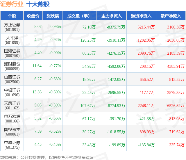 个股表现方面,证券行业当日领跌股为方正证券(601901),该股当日报收8.07,下跌0.98%,成交量72.1万,主力资金净流出8375.79万元。太平洋(601099)以下跌0.92%紧随其后,该股当日成交量120.25万,主力资金净流出3918.11万元。除此之外,国海证券(000750)、湘财股份(600095)、山西证券(002500)均进入当日熊股之列。具体个股列表见下表: