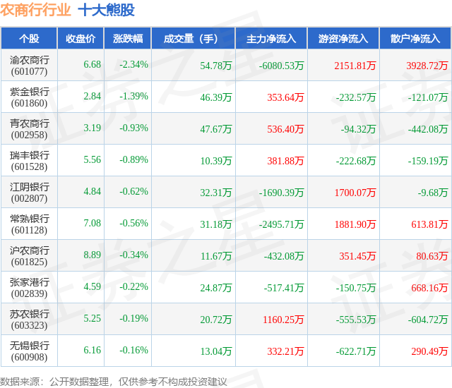 个股表现方面,农商行行业当日领跌股为渝农商行(601077),该股当日报收6.68,下跌2.34%,成交量54.78万,主力资金净流出6080.53万元。紫金银行(601860)以下跌1.39%紧随其后,该股当日成交量46.39万,主力资金净流入353.64万元。除此之外,青农商行(002958)、瑞丰银行(601528)、江阴银行(002807)均进入当日熊股之列。具体个股列表见下表: