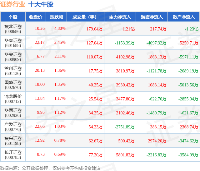 个股表现方面,证券行业当日领涨股为东北证券(000686),该股当日报收10.26,上涨4.8%,成交量179.64万,主力资金净流入1.21亿元。华泰证券(601688)以上涨2.45%紧随其后,该股当日成交量127.04万,主力资金净流出1153.39万元。除此之外,华安证券(600909)、首创证券(601136)、国盛证券(002670)均进入当日牛股之列。具体个股列表见下表: