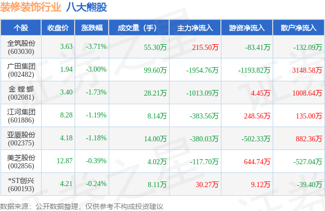 个股表现方面,装修装饰行业当日领跌股为全筑股份(603030),该股当日报收3.63,下跌3.71%,成交量55.3万,主力资金净流入215.5万元。广田集团(002482)以下跌3.0%紧随其后,该股当日成交量99.6万,主力资金净流出1954.76万元。除此之外,金 螳 螂(002081)、江河集团(601886)、亚厦股份(002375)均进入当日熊股之列。具体个股列表见下表: