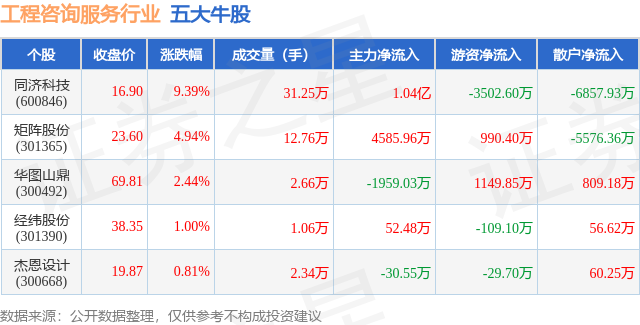 个股表现方面,工程咨询服务行业当日领涨股为同济科技(600846),该股当日报收16.9,上涨9.39%,成交量31.25万,主力资金净流入1.04亿元。矩阵股份(301365)以上涨4.94%紧随其后,该股当日成交量12.76万,主力资金净流入4585.96万元。除此之外,华图山鼎(300492)、经纬股份(301390)、杰恩设计(300668)均进入当日牛股之列。具体个股列表见下表:
