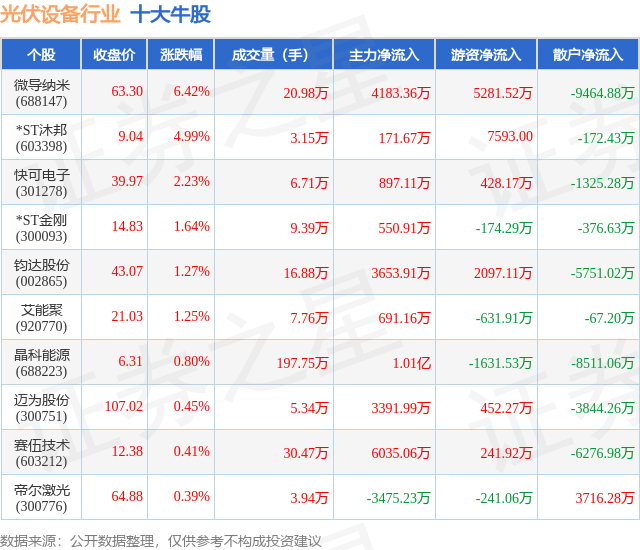 个股表现方面,光伏设备行业当日领涨股为微导纳米(688147),该股当日报收63.3,上涨6.42%,成交量20.98万,主力资金净流入4183.36万元。*ST沐邦(603398)以上涨4.99%紧随其后,该股当日成交量3.15万,主力资金净流入171.67万元。除此之外,快可电子(301278)、*ST金刚(300093)、钧达股份(002865)均进入当日牛股之列。具体个股列表见下表: