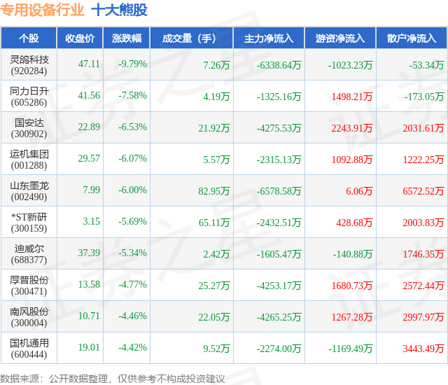 个股表现方面,专用设备行业当日领跌股为灵鸽科技(920284),该股当日报收47.11,下跌9.79%,成交量7.26万,主力资金净流出6338.64万元。同力日升(605286)以下跌7.58%紧随其后,该股当日成交量4.19万,主力资金净流出1325.16万元。除此之外,国安达(300902)、运机集团(001288)、山东墨龙(002490)均进入当日熊股之列。具体个股列表见下表: