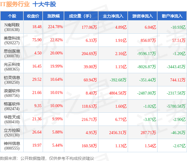 个股表现方面,IT服务行业当日领涨股为N南网数(301638),该股当日报收18.48,上涨224.78%,成交量177.06万,主力资金净流入4.89亿元。美登科技(920227)以上涨22.82%紧随其后,该股当日成交量6.33万,主力资金净流入1.91亿元。除此之外,思创医惠(300078)、光云科技(688365)、初灵信息(300250)均进入当日牛股之列。具体个股列表见下表: