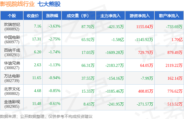 个股表现方面,影视院线行业当日领跌股为欢瑞世纪(000892),该股当日报收7.16,下跌3.63%,成交量87.7万,主力资金净流出421.35万元。中国电影(600977)以下跌2.75%紧随其后,该股当日成交量65.92万,主力资金净流出1.58亿元。除此之外,百纳千成(300291)、华谊兄弟(300027)、万达电影(002739)均进入当日熊股之列。具体个股列表见下表: