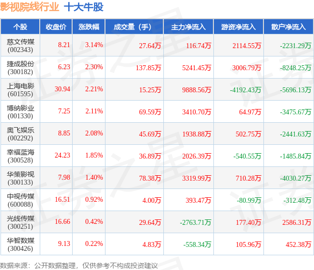 个股表现方面,影视院线行业当日领涨股为慈文传媒(002343),该股当日报收8.21,上涨3.14%,成交量27.64万,主力资金净流入116.74万元。捷成股份(300182)以上涨2.3%紧随其后,该股当日成交量137.85万,主力资金净流入5241.45万元。除此之外,上海电影(601595)、博纳影业(001330)、奥飞娱乐(002292)均进入当日牛股之列。具体个股列表见下表: