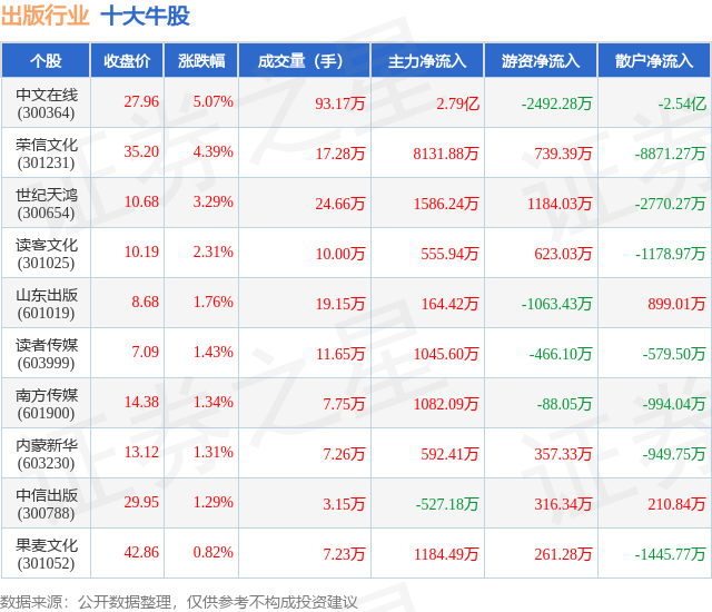 个股表现方面,出版行业当日领涨股为中文在线(300364),该股当日报收27.96,上涨5.07%,成交量93.17万,主力资金净流入2.79亿元。荣信文化(301231)以上涨4.39%紧随其后,该股当日成交量17.28万,主力资金净流入8131.88万元。除此之外,世纪天鸿(300654)、读客文化(301025)、山东出版(601019)均进入当日牛股之列。具体个股列表见下表: