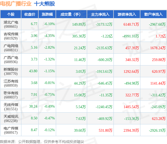 个股表现方面,电视广播行业当日领跌股为湖北广电(000665),该股当日报收6.77,下跌6.1%,成交量149.89万,主力资金净流出3173.12万元。吉视传媒(601929)以下跌4.35%紧随其后,该股当日成交量305.3万,主力资金净流出1.22亿元。除此之外,广电网络(600831)、广西广电(600936)、新媒股份(300770)均进入当日熊股之列。具体个股列表见下表: