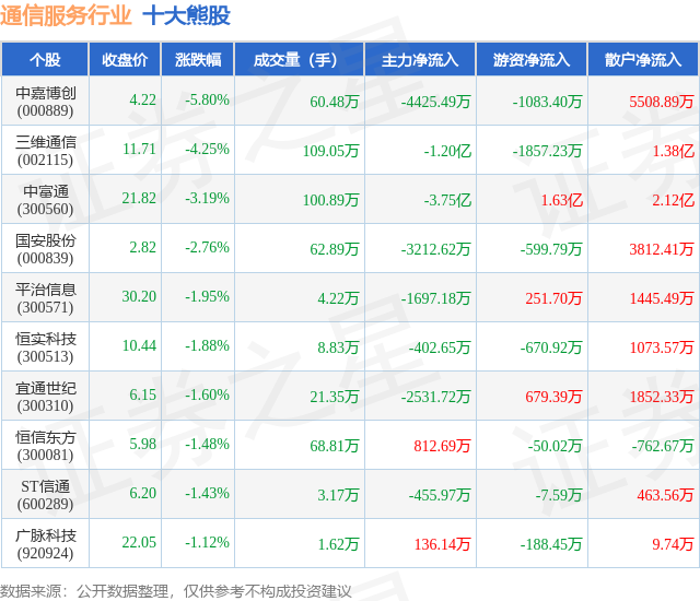 个股表现方面,通信服务行业当日领跌股为中嘉博创(000889),该股当日报收4.22,下跌5.8%,成交量60.48万,主力资金净流出4425.49万元。三维通信(002115)以下跌4.25%紧随其后,该股当日成交量109.05万,主力资金净流出1.2亿元。除此之外,中富通(300560)、国安股份(000839)、平治信息(300571)均进入当日熊股之列。具体个股列表见下表: