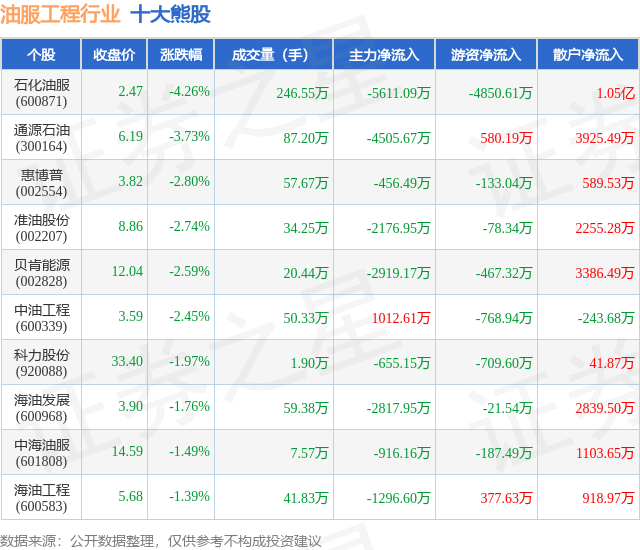 个股表现方面,油服工程行业当日领跌股为石化油服(600871),该股当日报收2.47,下跌4.26%,成交量246.55万,主力资金净流出5611.09万元。通源石油(300164)以下跌3.73%紧随其后,该股当日成交量87.2万,主力资金净流出4505.67万元。除此之外,惠博普(002554)、准油股份(002207)、贝肯能源(002828)均进入当日熊股之列。具体个股列表见下表: