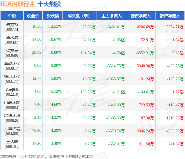 个股表现方面,环境治理行业当日领跌股为倍杰特(300774),该股当日报收16.38,下跌12.55%,成交量25.03万,主力资金净流出6461.41万元。清水源(300437)以下跌10.67%紧随其后,该股当日成交量61.11万,主力资金净流出1.05亿元。除此之外,福龙马(603686)、海峡环保(603817)、德创环保(603177)均进入当日熊股之列。具体个股列表见下表: