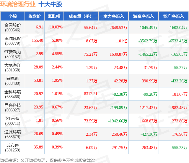 个股表现方面,环境治理行业当日领涨股为金圆股份(000546),该股当日报收6.91,上涨10.03%,成交量55.64万,主力资金净流入2648.53万元。惠城环保(300779)以上涨5.3%紧随其后,该股当日成交量8.07万,主力资金净流入1.01亿元。除此之外,ST新动力(300152)、大地海洋(301068)、赛恩斯(688480)均进入当日牛股之列。具体个股列表见下表: