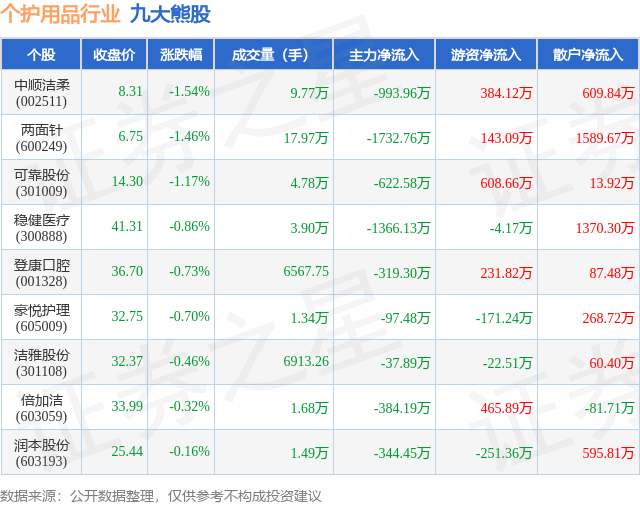 个股表现方面,个护用品行业当日领跌股为中顺洁柔(002511),该股当日报收8.31,下跌1.54%,成交量9.77万,主力资金净流出993.96万元。两面针(600249)以下跌1.46%紧随其后,该股当日成交量17.97万,主力资金净流出1732.76万元。除此之外,可靠股份(301009)、稳健医疗(300888)、登康口腔(001328)均进入当日熊股之列。具体个股列表见下表: