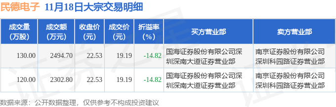 证券之星消息,11月18日民德电子发生大宗交易,交易数据如下: