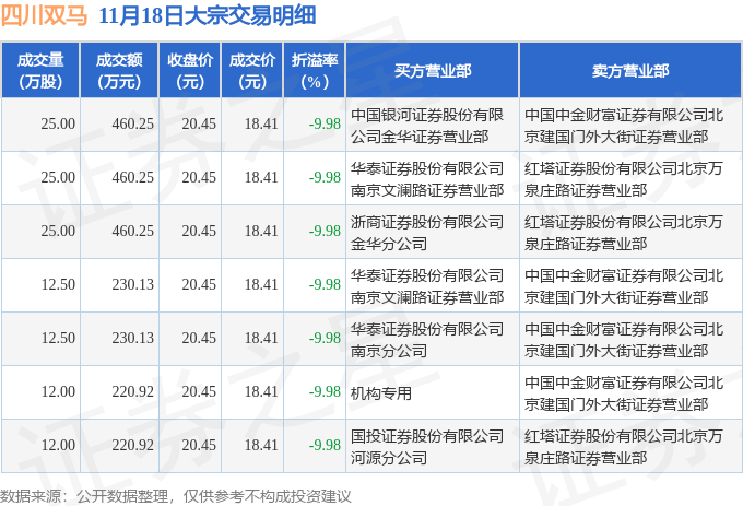 证券之星消息,11月18日四川双马发生大宗交易,交易数据如下: