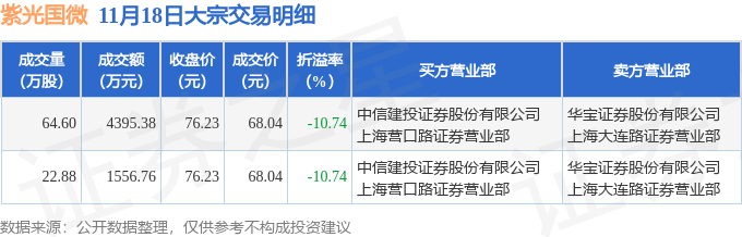 证券之星消息,11月18日紫光国微发生大宗交易,交易数据如下: