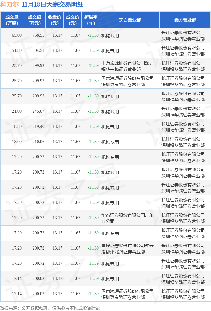 证券之星消息,11月18日科力尔发生大宗交易,交易数据如下: