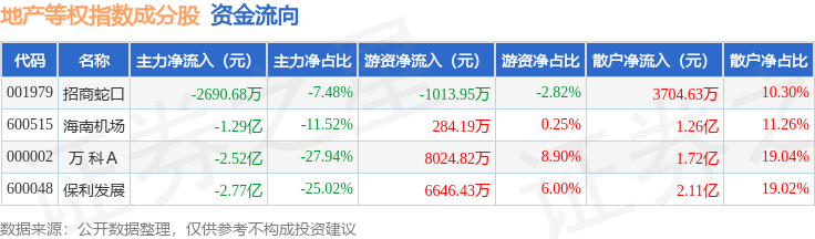 资金流向方面,地产等权(399983)指数成份股当日主力资金净流出合计6.85亿元,游资资金净流入合计1.39亿元,散户资金净流入合计5.45亿元。成份股资金流向详情见下表: