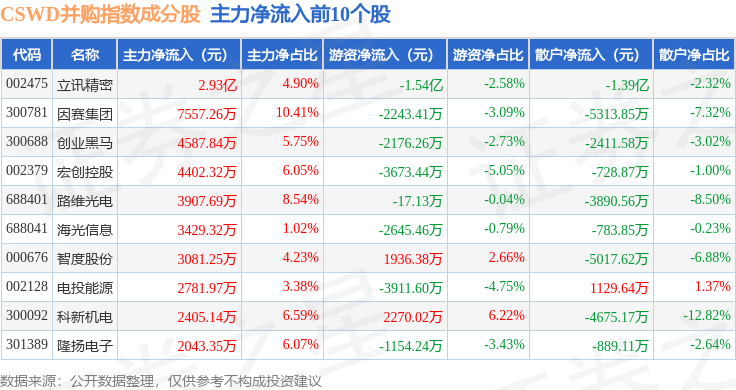 资金流向方面,CSWD并购(399992)指数成份股当日主力资金净流出合计23.33亿元,游资资金净流入合计4.47亿元,散户资金净流入合计18.87亿元。成份股资金流向详情见下表: