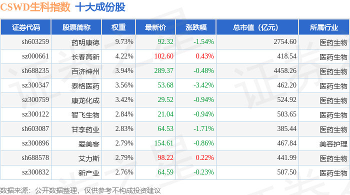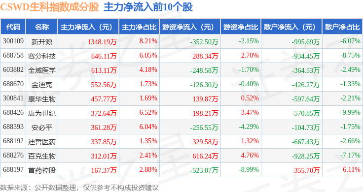 资金流向方面,CSWD生科(399993)指数成份股当日主力资金净流出合计24.5亿元,游资资金净流入合计5.6亿元,散户资金净流入合计18.9亿元。成份股资金流向详情见下表: