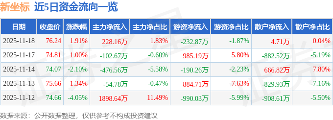 证券之星消息,截至2025年11月18日收盘,新坐标(603040)报收于76.24元,上涨1.91%,换手率1.2%,成交量1.63万手,成交额1.25亿元。