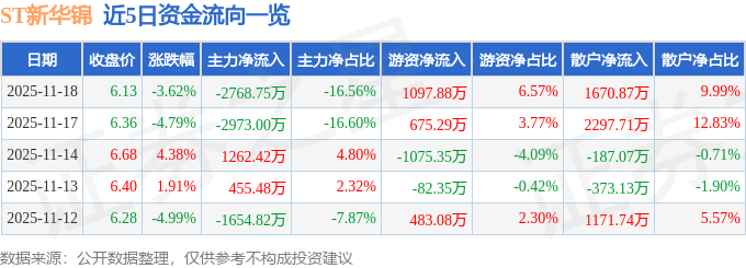 证券之星消息,截至2025年11月18日收盘,ST新华锦(600735)报收于6.13元,下跌3.62%,换手率6.35%,成交量27.03万手,成交额1.67亿元。