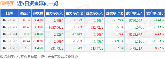 证券之星消息,截至2025年11月18日收盘,值得买(300785)报收于46.32元,上涨14.4%,换手率51.26%,成交量62.71万手,成交额28.42亿元。