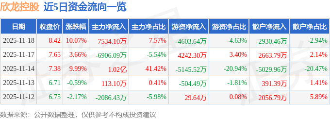 证券之星消息,截至2025年11月18日收盘,欣龙控股(000955)报收于8.42元,上涨10.07%,涨停,换手率23.3%,成交量125.35万手,成交额9.95亿元。