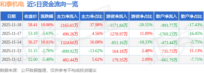 证券之星消息,截至2025年11月18日收盘,和泰机电(001225)报收于58.41元,上涨10.0%,涨停,换手率4.74%,成交量9965.0手,成交额5702.53万元。