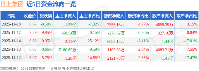 证券之星消息,截至2025年11月18日收盘,日上集团(002593)报收于6.67元,下跌8.5%,换手率40.04%,成交量223.75万手,成交额15.43亿元。