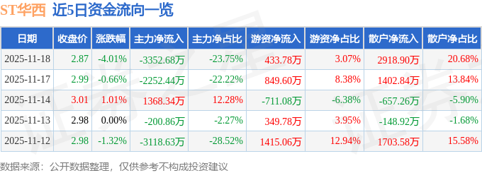 证券之星消息,截至2025年11月18日收盘,ST华西(002630)报收于2.87元,下跌4.01%,换手率4.72%,成交量48.58万手,成交额1.41亿元。