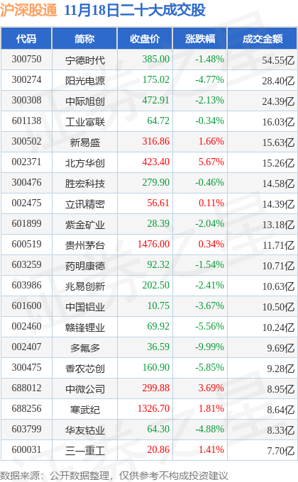 当日北向资金余额额度充足,浪潮软件(600756)领涨,涨幅10.01%,交易所公布的沪深股通二十大成交股中成交额前三的为宁德时代、阳光电源、中际旭创,成交额分别为54.55亿元、28.4亿元、24.39亿元。详情可见下表: