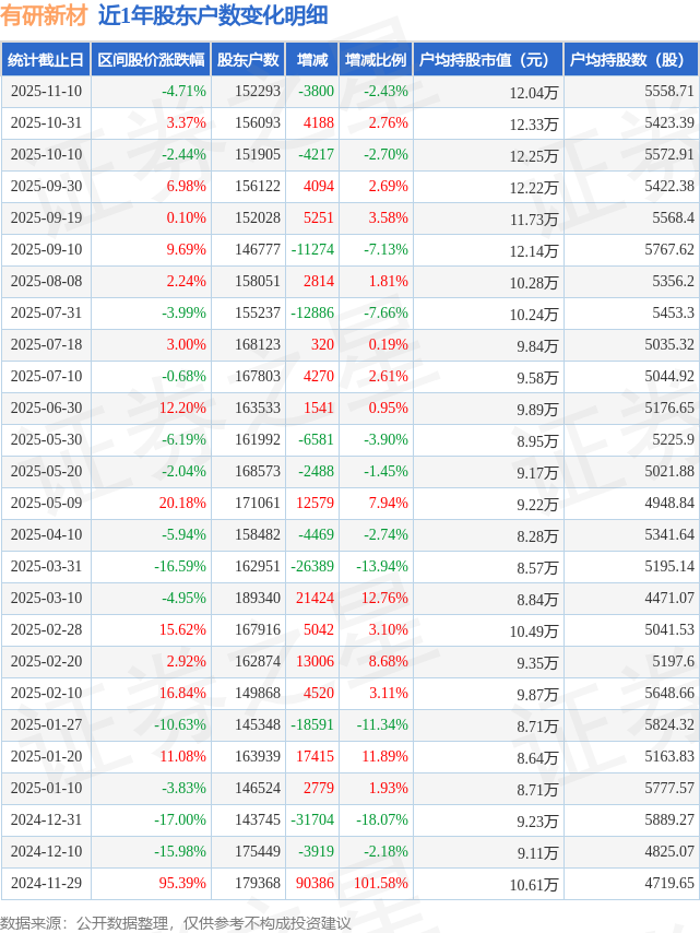从股价来看,2025年10月31日至2025年11月10日,有研新材区间跌幅为4.71%,在此期间股东户数减少3800.0户,减幅为2.43%。