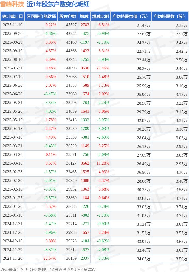 从股价来看,2025年9月30日至2025年11月10日,雪峰科技区间涨幅为0.22%,在此期间股东户数增加2783.0户,增幅为6.51%。