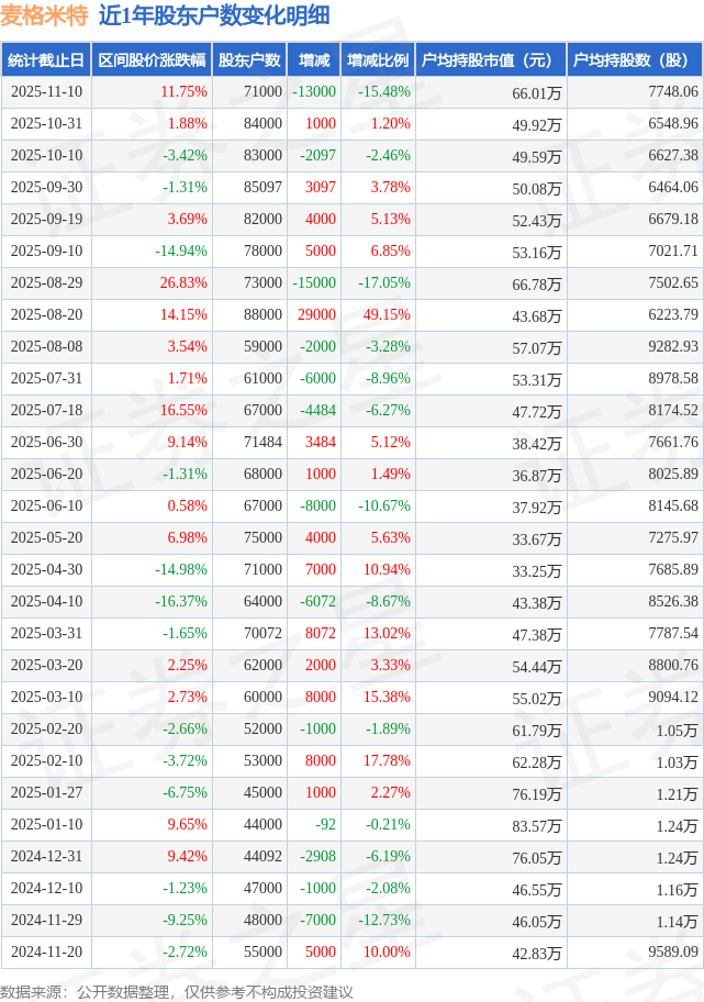 从股价来看,2025年10月31日至2025年11月10日,麦格米特区间涨幅为11.75%,在此期间股东户数减少1.3万户,减幅为15.48%。