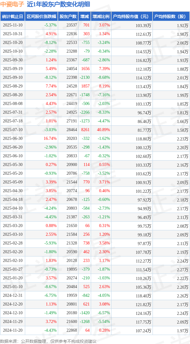 证券之星消息,近日中瓷电子披露,截至2025年11月10日公司股东户数为2.35万户,较10月31日增加701.0户,增幅为3.07%。户均持股数量由上期的1.98万股减少至1.92万股,户均持股市值为103.39万元。