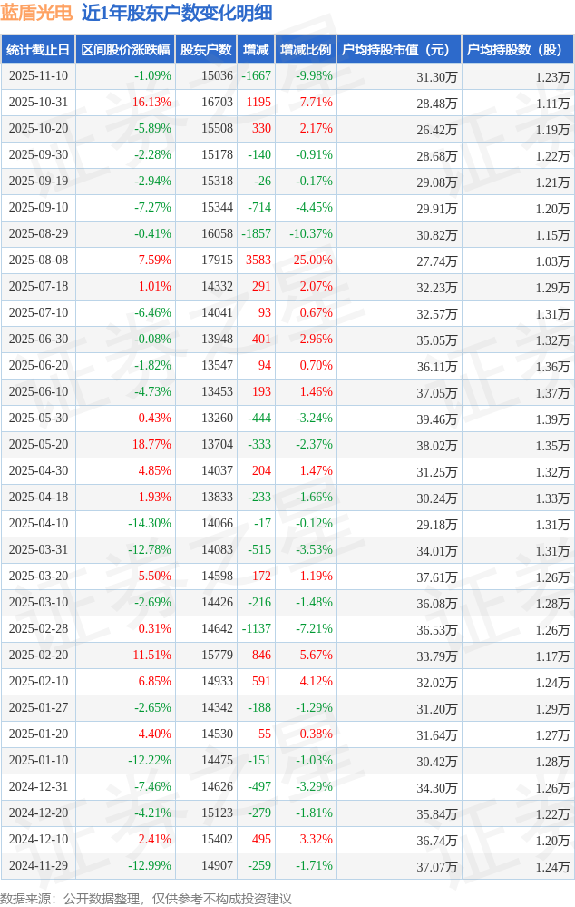 证券之星消息,近日蓝盾光电披露,截至2025年11月10日公司股东户数为1.5万户,较10月31日减少1667.0户,减幅为9.98%。户均持股数量由上期的1.11万股增加至1.23万股,户均持股市值为31.3万元。