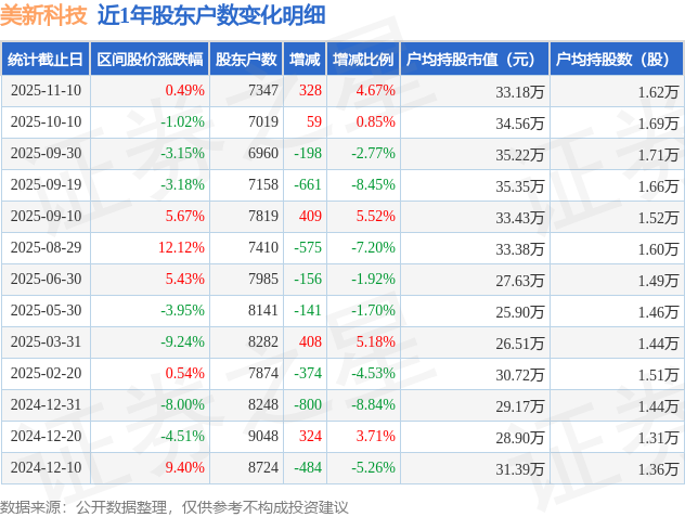 从股价来看,2025年10月10日至2025年11月10日,美新科技区间涨幅为0.49%,在此期间股东户数增加328.0户,增幅为4.67%。