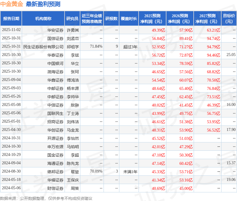 中金黄金2025年三季报显示,前三季度公司主营收入539.76亿元,同比上升17.23%;归母净利润36.79亿元,同比上升39.18%;扣非净利润42.14亿元,同比上升60.92%;其中2025年第三季度,公司单季度主营收入189.09亿元,同比上升7.97%;单季度归母净利润9.84亿元,同比上升9.28%;单季度扣非净利润12.56亿元,同比上升32.65%;负债率45.19%,投资收益-3.49亿元,财务费用2.22亿元,毛利率17.44%。