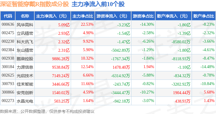 资金流向方面,深证智能穿戴R(470074)指数成份股当日主力资金净流出合计9.84亿元,游资资金净流出合计3.63亿元,散户资金净流入合计13.47亿元。成份股资金流向详情见下表: