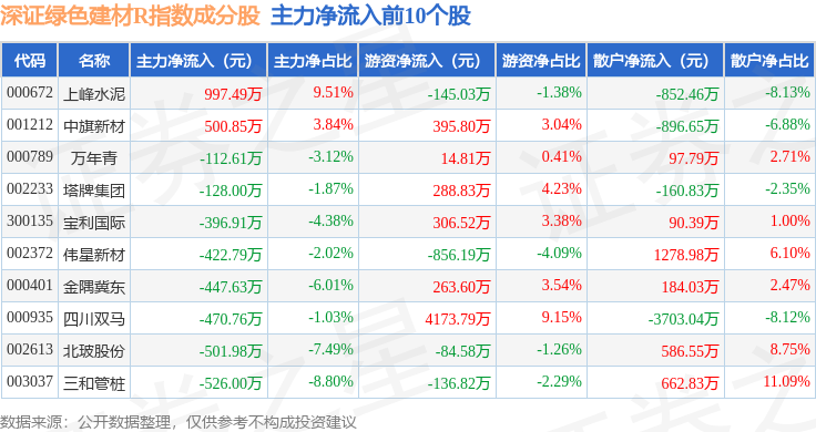 资金流向方面,深证绿色建材R(470077)指数成份股当日主力资金净流出合计5.28亿元,游资资金净流入合计1.92亿元,散户资金净流入合计3.36亿元。成份股资金流向详情见下表: