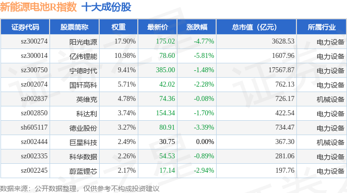 资金流向方面,新能源电池R(480027)指数成份股当日主力资金净流出合计79.61亿元,游资资金净流入合计26.42亿元,散户资金净流入合计53.2亿元。成份股资金流向详情见下表: