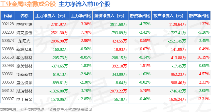 资金流向方面,工业金属R(480043)指数成份股当日主力资金净流出合计64.29亿元,游资资金净流入合计10.94亿元,散户资金净流入合计53.35亿元。成份股资金流向详情见下表: