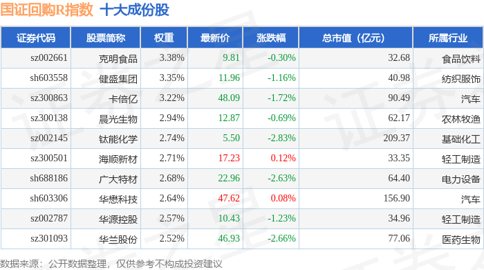 证券之星消息,11月18日,国证回购R(480063)指数报收于3989.61点,跌1.35%,成交135.96亿元,换手率1.67%。当日该指数成份股中,上涨的有12家,京新药业以7.9%的涨幅领涨,下跌的有38家,神马股份以7.49%的跌幅领跌。
