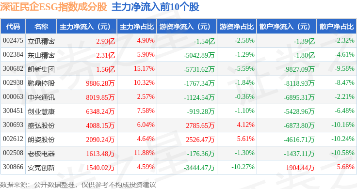 资金流向方面,深证民企ESG(970056)指数成份股当日主力资金净流出合计91.61亿元,游资资金净流入合计26.6亿元,散户资金净流入合计65.01亿元。成份股资金流向详情见下表: